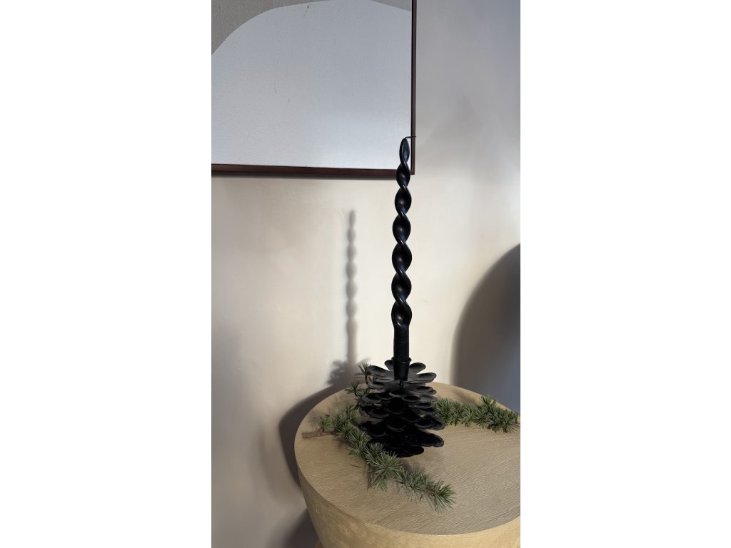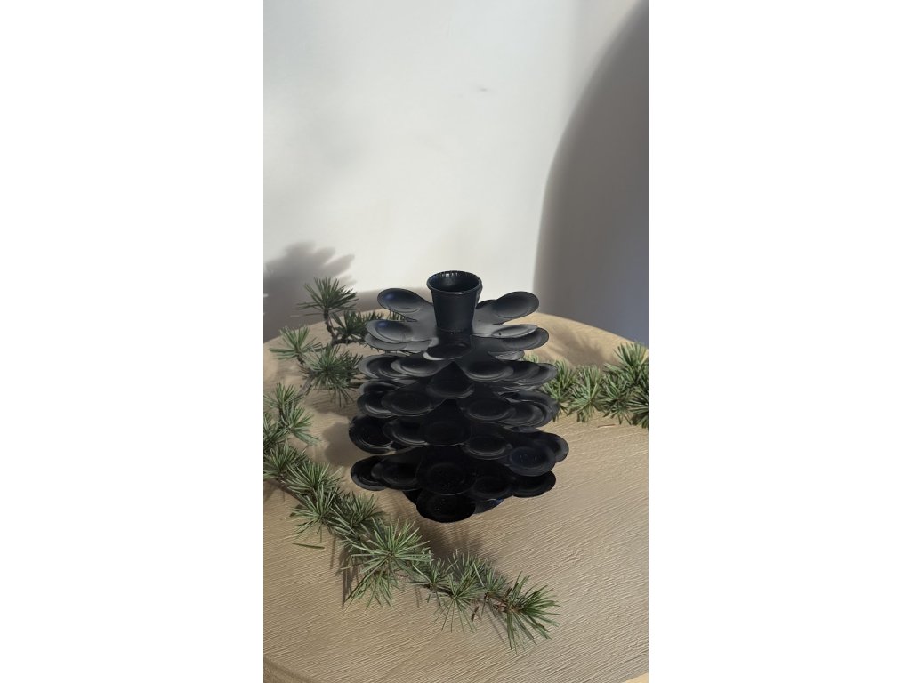 Stylový svícen z černého kovu ve tvaru šišky vnese do interiéru nádech elegance i přírody. Krásně vynikne na svátečně prostřeném stole, komodě nebo parapetu.