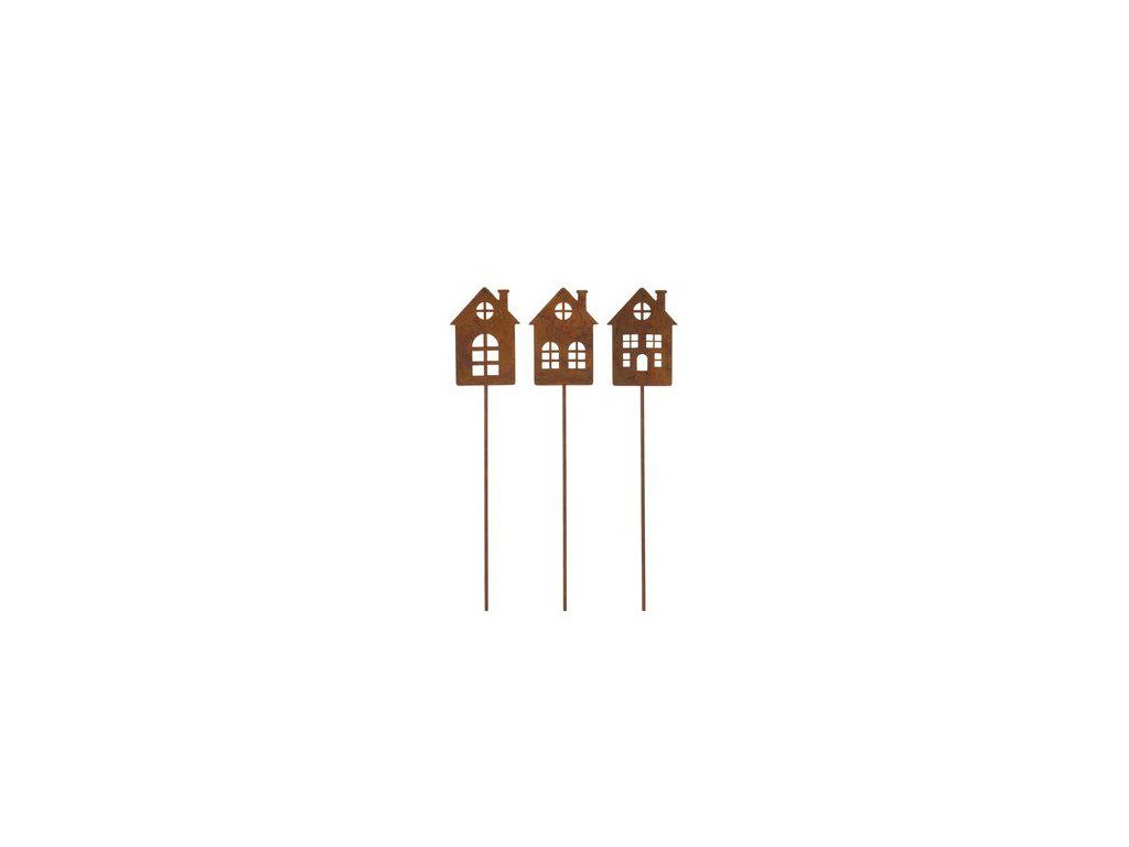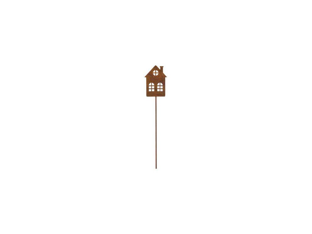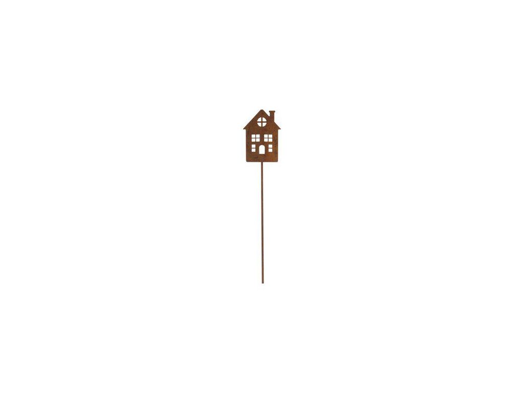 Rezavý zápich ve tvaru domečku je vyroben z kovu s patinou rzi, která mu dodává jedinečný vintage vzhled. Skvěle se hodí do truhlíků, květinových záhonů, osázených misek.